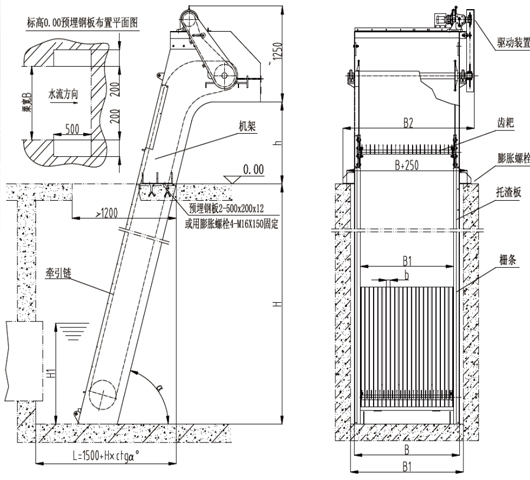 該設備是由 ABS 工程塑料、尼龍或不銹鋼制成的特殊形耙齒,按一定的排列次序裝在耙齒軸上形成封閉 式耙齒鏈,其下部裝在進水渠水中。當傳動系統帶動鏈輪作勻速定向旋轉時,整個耙齒鏈自上而下運動,并攜 帶固體雜物從液體中分離出來,流體通過耙齒間隙流出去,整個工作狀態連續進行。