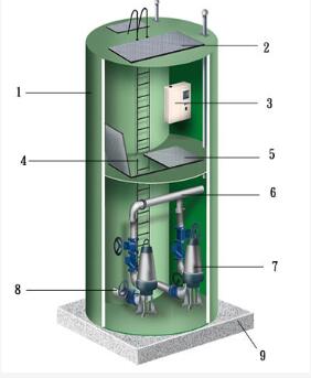 (1)一體化污水泵站的筒體采用玻璃鋼制作而成。 (2)組裝好的潛水排污泵(包括泵殼,葉輪,電機(jī),機(jī)械密封件,泵軸等) (3)自動連接裝置和底座 (4)提升裝置(導(dǎo)軌系統(tǒng)和支架等) (5)壓力管道系統(tǒng)和閥門 (6)靜壓液位計和智能控制柜; (7)連接配件和所有用于安裝的緊固件;