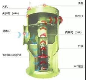 將泵、管道、控制系統和通風系統等集成為一體,并在工程預制生產,用于提升和輸送水介質的泵站。泵站主體由筒體、水泵、提升裝置、管道、閥門、格柵、液位傳感器、控制系統和通風系統等部件組成。 一體化預制泵站在歐洲有超過60年的研究、開發和使用歷史,已成為歐洲市政給水、排水泵站的主要解決方案。近10年來,隨著一體化預制泵站在世界范圍內的推廣,已經遍布世界各地,為各地提供服務。 1、一體化泵站內部結構圖: 一體化預制泵站外殼為筒體,內部用一根內井筒代替內部管道,水泵安裝在內井筒中,水流從進水口進入筒體,經過筒體底部的整流板后進入內井筒,經過水泵加壓后,沿著內井筒向上打到出水口。