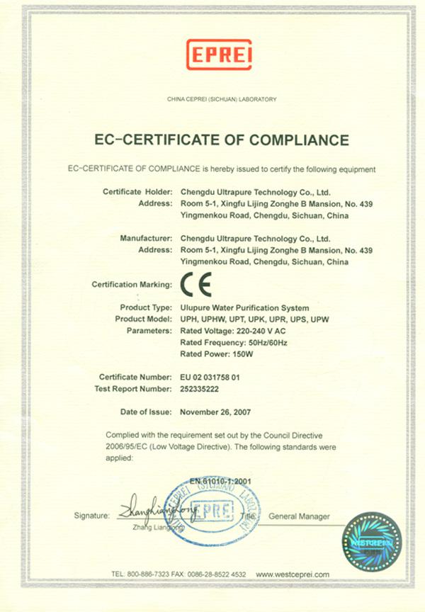 | 優普超純水器通過歐盟CE認證已批量出口歐盟各國 |