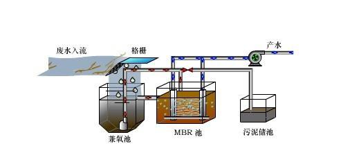 篩分過程,膜生物反應器(MBR)操作壓力0-35KPa,混合液在靜壓差或自吸泵的作用下,透過纖維素或高分子材料制成的微孔濾膜,利用其均一孔徑,來截留水中的微粒、細菌等,使其不能通過濾膜而被去除。 3.膜生物反應器工藝路線