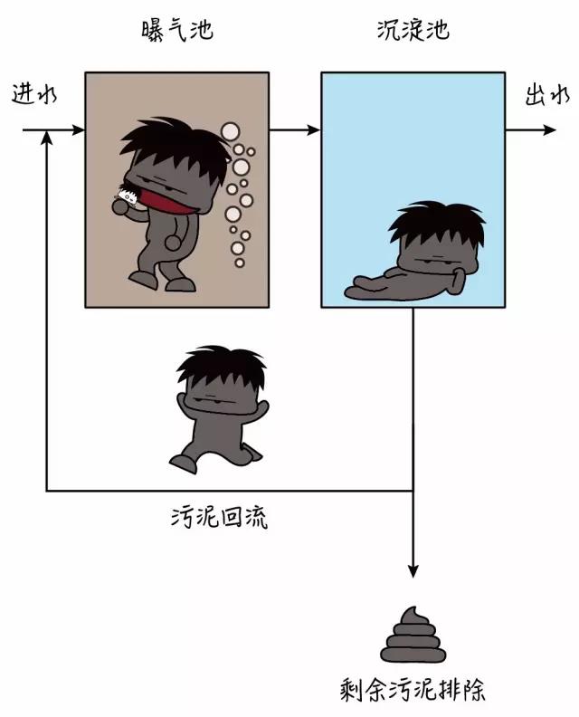簡單總結一下活性污泥法的運作過程,先在曝氣池吃飯,然后進沉淀池睡覺,睡醒了就順著回流管跑回曝氣池接著吃,XXXX直接排掉。
