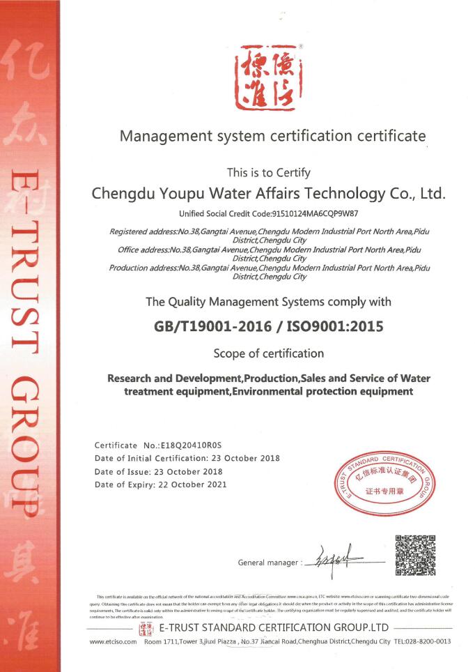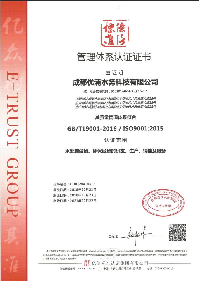 2018年10月23日,成都優浦水務科技有限公司順利通過了ISO9001:2015質量管理體系認證。 從申報、提交材料、審查認定,再到發放證書等,優浦水務經過認證專家的嚴格仔細的考量,最終確認我們公司質量管理符合ISO9001:2015的標準要求,并與2018年10月23日,向我們公司正式頒發了ISO9001:2015質量管理體系證書。 本次認證涵蓋了優浦公司水處理設備、環保設備的研發、生產、銷售、及服務相關管理的全過程,確保所有生產都符合質量管理體系相關法律法規的要求。本次能夠順利通過管理體系認證,也是因為公司管理者對于公司產品質量的高度重視,今日我們也將嚴格按照質量管理體系的要求,保質保量生產。